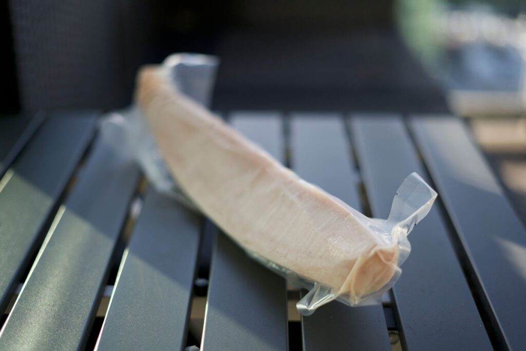 Using a very sharp knife, slice the tuna into 1 cm thick portions. (Tip: if the tuna falls apart, wrap the tuna tightly in clingfilm before slicing to achieve clean cuts… Just remember to remove all the clingfilm before serving!)